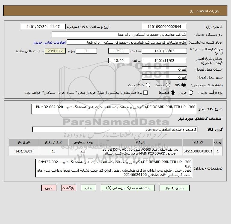 توضیحات خریدار:DC BOARD PRINTER HP 1300با گارانتی و ضمانت یکساله با کارشناس هماهنگ شود PN:432-002-020 تحویل جنس جلوی درب ادارات مرکزی هواپیمایی هما. ایران کد جهت تشابه است نحوه پرداخت سه ماه است کارشناس آقای صادقی 02146624106