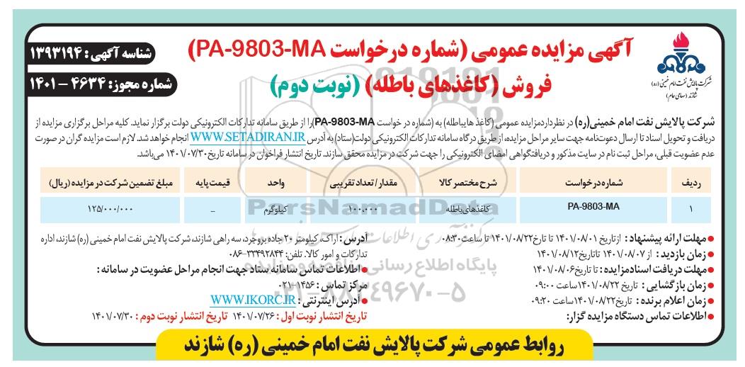 شرکت پالایش نفت امام خمینی (ره) در نظر دارد مزایده عمومی (کاغذهای باطله) به (شماره درخواست PA- 9803-MA) را از طریق سامانه تدارکات الکترونیکی دولت برگزار نماید.کلیه مراحل برگزاری مزایده از دریافت اسناد و تحویل اسناد تا ارسال دعوت نامه جهت سایر مراحل مزایده از طریق درگاه سامانه تدارکات الکترونیکی دولت به آدرس ستاد ایران انجام خواهد شد. لازم است مزایده گران در صورت عدم عضویت قبلی مراحل ثبت نام در سایت مذکور و دریافت گواهی امضای الکترونیکی را جهت شرکت در مناقصه محقق سازند. تاریخ انتشار فراخوان در سامانه تاریخ 1401.7.30 می باشد.