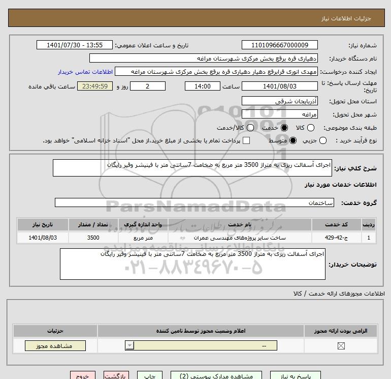 شرح کلی نیاز: اجرای آسفالت ریزی به متراژ 3500 متر مربع به ضخامت 7سانتی متر با فینیشر وقیر رایگان