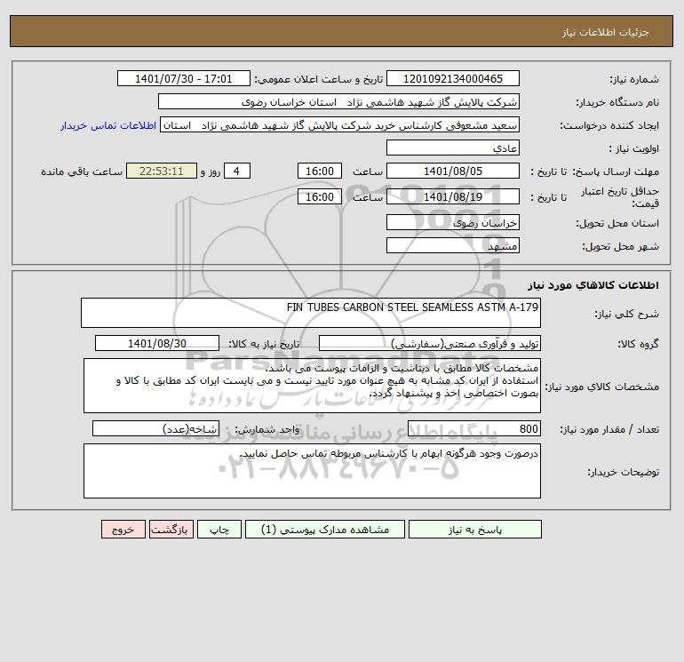 نام دستگاه خریدار:شرکت پالایش گاز شهید هاشمی نژاد استان خراسان رضوی