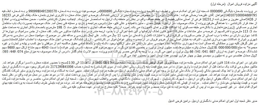 در پرونده بشماره بایگانی 0000690 شعبه اول اجرای احکام مدنی وعطف به کلاسه پرونده به شماره بایگانی 0000690در موضوعیت پرونده به شماره 9909980495200570 و به شماره ابلاغیه 140107100004669795{خواهان :آقای علیرضا رضائی خوانده : خانم گلناز دادرس } در خصوص موضوع مبنی بر ارزیابی ششدانگ عرصه و اعیان ملک مغازه با کاربری تجاری بشماره ملک پلاک ثبتی فرعی 16233 از 5426اصلی مفروز و مجزی شده از16231 فرعی از اصلی مذکور،قطعه 2 در طبقه همکف واقع در بخش دو منطقه یک اردبیل به استحضار می رساند. اینجانب، بعنوان کارشناس منتخب ، ضمن مطالعه پرونده و اطلاع از مفاد قرار کارشناسی ، با هماهنگی طرفین پرونده از ملک موصوف ،در اردبیل ، خیابان سعدی ، مابین باغمیشه و عالی قاپو- مبل دادرس، مراجعه و بازدید و معاینه فنی بعمل آمد. ملک موصوف بصورت یک باب ساختمان تجاری و مسکونی {زیرزمین+تجاری با بالکن+دو طبقه مسکونی }با اسکلت فلزی و نمای کامپوزیت می باشد. مورد ارزیابی طبقه همکف تجاری با مساحت طبق سند 5/ 198 مترمربع بانضمام بالکن تجاری به مساحت طبق سند 3/ 113 مترمربع با قدرالسهم از عرصه و سایر مشاعات و مشترکات طبق قانون تملک آپارتمانها و آئین نامه اجرائی آن با حدود اربعه مندرج در سند مالکیت مذکور می باشد. کف مغازه از جنس سرامیک و دیوارها از کاغذ دیواری دارای دو دهانه با درب اصلی از جنس سکوریت و کرکره برقی با امتیازات کامل و با قدمتی در حدود 15 سال می باشد. علی ایحال بابررسی و مداقه نظر در موضوع ، موقعیت محل در دسترسی به مراکز شهری و شوارع ،امکانات بهره برداری تجاری ، اشراف به خیابان اصلی ،بازار خریدو فروش در آن محدوده وسایر عوامل موثر در کارشناسی ، ارزش ششدانگ عرصه و اعیان ملک موصوف با احتساب امتیازانشعابات،بدون در نظر گرفتن کلیه دیون و مطالباتی که ممکن است به شهرداری ،بانک ها ،نظام مهندسی ،سایر بازداشتی هاو سایر ارگانها وجود داشته باشد و بالحاظ تمامی حقوق مکتسبه اعم از سرقفلی یا حق کسب و پیشه و تجارت و غیره مجموعا" به مبلغ/000/000/000/ 158ریال معادل پانزده میلیاردوهشتصد میلیون تومان برآورد و بحضور تقدیم می گردد. و سهم مرحوم آقای صدیف دادرس (پدر خوانده) با نسبت 4043 سهم مشاع ازکل سهم 9600 سهم ششدانگ عرصه و اعیان به ارزش 667/ 041/ 541/ 66 ریال برآورد و تعیین می گردد. و با توجه به گواهی حصر وراثت ضم پرونده ،سهم الارث خانم گلناز دادرس از ملک موصوف به میزان مبلغ 074/ 449/ 393/ 7ریال معادل هفتصدو سی و نه میلیون و سیصدو چهل و چهار هزارو نهصدو هفت تومان تعیین و بحضور ایفاد می گردد.