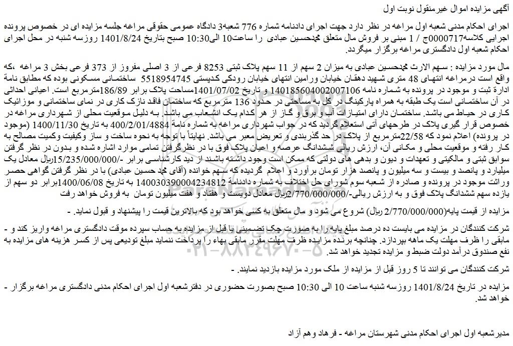 مال مورد مزایده : سهم الارث محمدحسین عبادی به میزان 2 سهم از 11 سهم پلاک ثبتی 8253 فرعی از 3 اصلی مفروز از 373 فرعی بخش 3 مراغه ،که واقع است درمراغه انتهای 48 متری شهید دهقان خیابان ورامین انتهای خیابان رودکی کدپستی 5518954745 ساختمانی مسکونی بوده که مطابق نامة ادارة ثبت و موجود در پرونده به شماره نامه 140185604002007106 و تاریخ 1401/07/02مساحت پلاک برابر 186/89مترمربع است. اعیانی احداثی در آن ساختمانی است یک طبقه به همراه پارکینگ در کل به مساحتی در حدود 136 مترمربع که ساختمان فاقد نازک کاری در نمای ساختمانی و موزائیک کاری در حیاط می باشد. ساختمان دارای امتیازات آب و برق و گاز از هر کدام یک انشعاب می باشد. به دلیل موقعیت محلی از شهرداری مراغه در خصوص قرار گیری پلاک در طرحهای آتی استعلام گردید که در جواب شهرداری مراغه به شماره نامة 400/2/01/4884 به تاریخ 1400/11/30 (موجود در پرونده) اعلام نمود که 22/58مترمربع از پلاک در حد گذربندی و تعریض معبر می باشد. نهایتاً با توجه به نحوه ساخت و ساز وکیفیت وکمیت مصالح به کار رفته و موقعیت محلی و مکانی آن، ارزش ریالی ششدانگ عرصه و اعیان پلاک فوق با در نظرگرفتن تمامی موارد اشاره شده و بدون در نظر گرفتن سوابق ثبتی و مالکیتی و تعهدات و دیون و بدهی های دولتی که ممکن است وجود داشته باشند از دید کارشناسی برابر -/15/235/000/000ریال معادل یک میلیارد و پانصد و بیست و سه میلیون و پانصد هزار تومان برآورد و اعلام گردیده که سهم خوانده (آقای محمد حسین عبادی) با در نظر گرفتن گواهی حصر وراثت موجود در پرونده و صادره از شعبه سوم شورای حل اختلاف به شماره دادنامة 140030390004234812 به تاریخ 1400/06/08برابر دو سهم از یازده سهم ششدانگ پلاک فوق و به ارزش ریالی-/2/770/000/000ریال معادل دویست و هفتاد و هفت میلیون تومان به فروش خواهد رفت