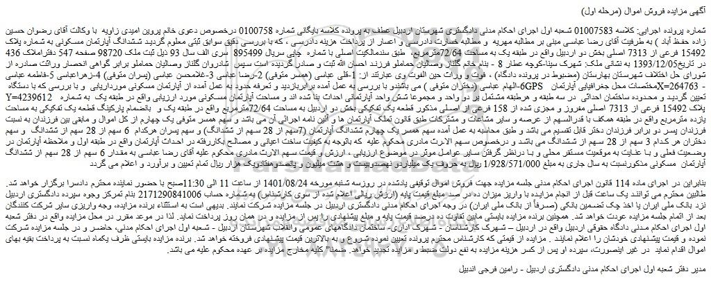 شماره پرونده اجرایی: کلاسه 01007583 شعبه اول اجرای احکام مدنی دادگستری شهرستان اردبیل عطف به پرونده کلاسه بایگانی شماره 0100758 درخصوص دعوی خانم پروین امیدی زاویه با وکالت آقای رضوان حسین زاده حفظ آباد ) به طرفیت آقای رضا عباسی مبنی بر مطالبه مهریه و مطالبه خسارت دادرسی و اعسار از پرداخت هزینه دادرسی ، که با بررسی دقیق سوابق ثبتی معلوم گردید ششدانگ آپارتمان مسکونی به شماره پلاک 15492 فرعی از 7313 اصلی بخش دو اردبیل واقع در طبقه یک به مساحت 72/64مترمربع، طبق سندمالکیت اصلی با شماره چاپی سریال 895499 سری الف سال 93 ذیل ثبت ملک 98720 صفحه 547 دفتراملاک 436 در تاریخ1393/12/05 به نشانی ملک: شهرک سینا-کوچه عطار 8 - بنام خانم گلناز وصالیان حماملو فرزند احسان الله ثبت و صادر گردیده است سپس شادروان گلناز وصالیان حماملو برابر گواهی انحصار وراثت صادره از شورای حل اختلاف شهرستان بهارستان (مضبوط در پرونده دادگاه) ، فوت و وراث حین الفوت وی عبارتند از: 1-قلی عباسی (همسر متوفی) 2-رضا عباسی 3-غلامحسن عباسی (پسران متوفی) 4-زهراعباسی 5-فاطمه عباسی 6-الهام عباسی (دختران متوفی ) می باشندو با بررسی به عمل آمده برابربازدید و تعرفه حدود به عمل آمده از آپارتمان مسکونی مورداریابی و با بررسی که با دستگاه GPS مختصات محل جغرافیایی آپارتمان X=264763 -Y=4239612 تعیین گردید و محدوده ساختمان احداثی در سه طبقه و هرطبقه مشتمل بر دو واحد و مجموعا شش واحد آپارتمانی احداث بنا شده اند و مساحت آپارتمان مسکونی مورد ارزیابی واقع در طبقه یک به شماره پلاک 15492 فرعی از 7313 اصلی مفروز و مجزی شده از 158 فرعی از اصلی مذکور قطعه یک تفکیکی بخش دو اردبیل به مساحت 72/64مترمربع واقع در طبقه یک و بانضمام پارکینگ قطعه یک تفکیکی به مساحت یازده مترمربع واقع در طبقه همکف با قدرالسهم از عرصه و سایر مشاعات و مشترکات طبق قانون تملک آپارتمان ها و آئین نامه اجرائی آن می باشد و سهم همسر متوفی یک چهارم از کل اموال و مابقی بین فرزندان به نسبت فرزندان پسر دو برابر فرزندان دختر قابل تقسیم می باشد و طبق محاسبه به عمل آمده سهم همسر یک چهارم ششدانگ آپارتمان (7سهم از 28 سهم از ششدانگ) و سهم پسران هرکدام 6 سهم از 28 سهم از ششدانگ و سهم دختران هر کدام 3 سهم از 28 سهم از ششدانگ می باشد و درخصوص سهم الارث مادری محکوم علیه که باتوجه به کیفیت ساخت اعیانی و مصالح بکاررفته در احداث آپارتمان واقع در طبقه اول و ملاحظه آپارتمان در وضعیت فعلی و با عنایت به موقعیت مستقر محلی و با درنظر گرفتن سایر عوامل موثر در موضوع ارزیابی ، ارزش و قیمت سهم الارث مادری محکوم علیه آقای رضا عباسی به مقدار 6 سهم از 28 سهم از ششدانگ آپارتمان مسکونی مذکورنسبت به سال جاری به مبلغ 1/928/571/000 ریال به حروف یک میلیاردو نهصدوبیست و هشت میلیون و پانصدوهفتادویک هزار ریال تمام تعیین و برآورد و اعلام می گردد