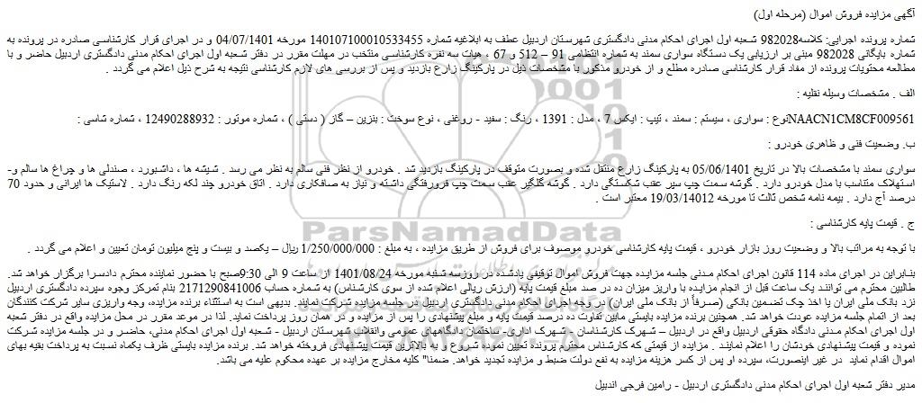 شماره پرونده اجرایی: کلاسه982028 شعبه اول اجرای احکام مدنی دادگستری شهرستان اردبیل عطف به ابلاغیه شماره 140107100010533455 مورخه 04/07/1401 و در اجرای قرار کارشناسی صادره در پرونده به شماره بایگانی 982028 مبنی بر ارزیابی یک دستگاه سواری سمند به شماره انتظامی 91 – 512 و 67 ، هیات سه نفره کارشناسی منتخب در مهلت مقرر در دفتر شعبه اول اجرای احکام مدنی دادگستری اردبیل حاضر و با مطالعه محتویات پرونده از مفاد قرار کارشناسی صادره مطلع و از خودرو مذکور با مشخصات ذیل در پارکینگ زارع بازدید و پس از بررسی های لازم کارشناسی نتیجه به شرح ذیل اعلام می گردد .