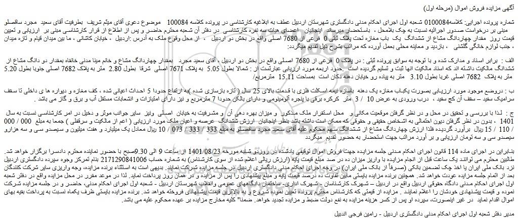 شماره پرونده اجرایی: کلاسه0100084 شعبه اول اجرای احکام مدنی دادگستری شهرستان اردبیل عطف به ابلاغیه کارشناسی در پرونده کلاسه 100084   موضوع دعوی آقای میثم شریف  بطرفیت آقای سعید  مجرد ساقصلو    مبنی بر درخواست صدور اجرائیه نسبت به چک بلامحل ،  باستحضار میرساند  اینجانبان   اعضای هیات سه نفره کارشناسی  در دفتر آن شعبه محترم حاضر و پس از اطلاع از قرار کارشناسی مبنی بر  ارزیابی و تعیین قیمت روز  مقدار چهاردانگ مشاع از ششدانگ  یک  باب مغازه تحت پلاک ثبتی 0  فرعی از 7680 اصلی واقع در بخش دو اردبیل   ،  از محل وقوع ملک به آدرس :اردبیل  ، خیابان کاشانی ، ما بین میدان قیام و تازه میدان ، جنب لوازم خانگی گلشنی   ، بازدید و معاینه محلی بعمل آورده که مراتب بشرح ذیل تقدیم میگردد: