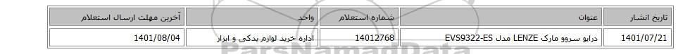 1401/07/21درایو ‎سروو مارک LENZE‎ مدل ‎EVS9322-ES14012768اداره خرید لوازم یدکی و ابزار1401/08/04
