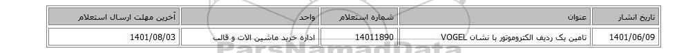 | 1401/06/09 | تامین یک ردیف الکتروموتور با نشان VOGEL | 14011890 | اداره خرید ماشین الات و قالب | 1401/08/03 |