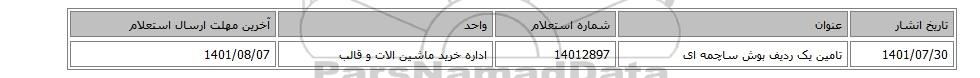 1401/07/30تامین یک ردیف بوش ‎ساچمه ای‏14012897اداره خرید ماشین الات و قالب1401/08/07