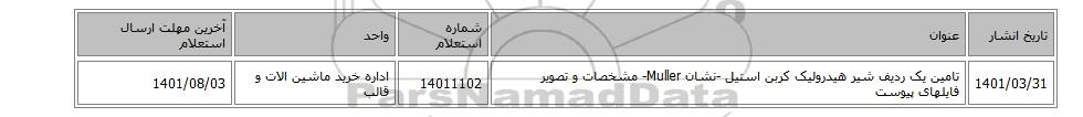 | 1401/03/31 | تامین یک ردیف شیر هیدرولیک کربن استیل -نشان Muller- مشخصات و تصویر فایلهای پیوست | 14011102 | اداره خرید ماشین الات و قالب | 1401/08/03 |