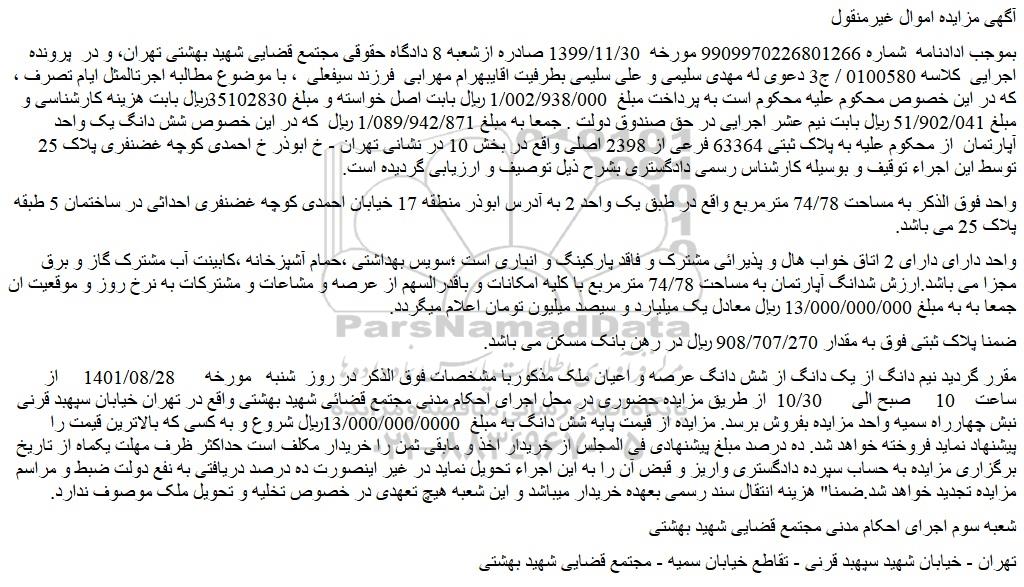 بموجب ادادنامه  شماره 9909970226801266 مورخه  1399/11/30 صادره ازشعبه 8 دادگاه حقوقی مجتمع قضایی شهید بهشتی تهران، و در  پرونده اجرایی  کلاسه 0100580 / ج3 دعوی له مهدی سلیمی و علی سلیمی بطرفیت اقایبهرام مهرابی  فرزند سیفعلی  ، با موضوع مطالبه اجرتالمثل ایام تصرف ، که در این خصوص محکوم علیه محکوم است به پرداخت مبلغ  1/002/938/000 ریال بابت اصل خواسته و مبلغ 35102830ریال بابت هزینه کارشناسی و مبلغ 51/902/041 ریال بابت نیم عشر اجرایی در حق صندوق دولت . جمعا به مبلغ 1/089/942/871 ریال  که در این خصوص شش دانگ یک واحد آپارتمان  از محکوم علیه به پلاک ثبتی 63364 فرعی از 2398 اصلی واقع در بخش 10 در نشانی تهران - خ ابوذر خ احمدی کوچه غضنفری پلاک 25 توسط این اجراء توقیف و بوسیله کارشناس رسمی دادگستری بشرح ذیل توصیف و ارزیابی گردیده است.