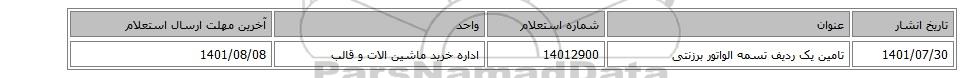 | 1401/07/30 | تامین یک ردیف تسمه الواتور برزنتی | 14012900 | اداره خرید ماشین الات و قالب | 1401/08/08 |
