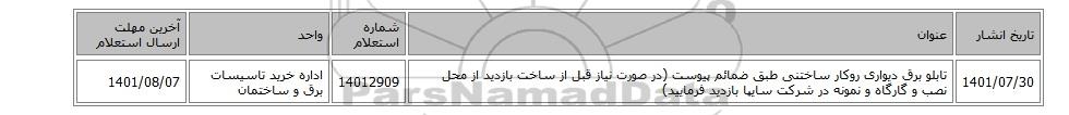 | 1401/07/30 | تابلو برق دیواری روکار ساختنی طبق ضمائم پیوست (در صورت نیاز قبل از ساخت بازدید از محل نصب و گارگاه و نمونه در شرکت سایپا بازدید فرمایید) | 14012909 | اداره خرید تاسیسات برق و ساختمان | 1401/08/07 |