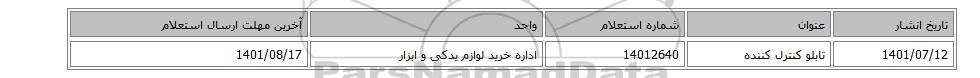 | 1401/07/12 | تابلو کنترل کننده | 14012640 | اداره خرید لوازم یدکی و ابزار | 1401/08/17 |
