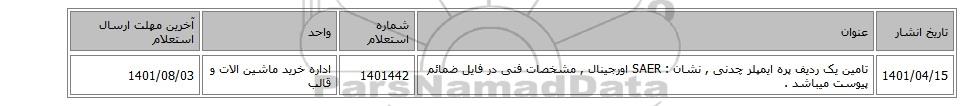 1401/04/15تامین یک ردیف پره ایمپلر چدنی , نشان : SAER اورجینال , مشخصات فنی در فایل ضمائم پیوست میباشد .1401442اداره خرید ماشین الات و قالب1401/08/03