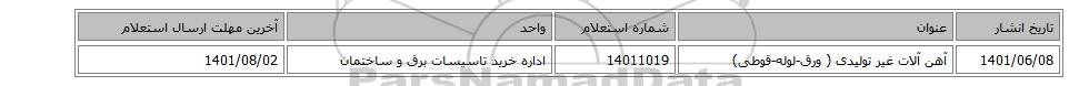 | 1401/06/08 | آهن آلات غیر تولیدی ( ورق-لوله-قوطی) | 14011019 | اداره خرید تاسیسات برق و ساختمان | 1401/08/02 |