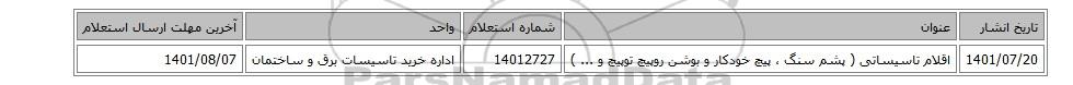 | 1401/07/20 | اقلام تاسیساتی ( پشم سنگ ، پیچ خودکار و بوشن روپیچ توپیچ و ... ) | 14012727 | اداره خرید تاسیسات برق و ساختمان | 1401/08/07 |