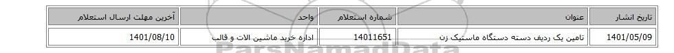 | 1401/05/09 | تامین یک ردیف دسته دستگاه ماستیک زن | 14011651 | اداره خرید ماشین الات و قالب | 1401/08/10 |