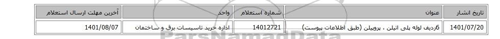 1401/07/206ردیف لوله پلی اتیلن ، پروپیلن (طبق اطلاعات پیوست)14012721اداره خرید تاسیسات برق و ساختمان1401/08/07