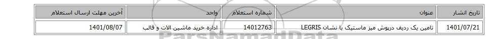 1401/07/21تامین یک ردیف درپوش میز ماستیک با نشان LEGRIS14012763اداره خرید ماشین الات و قالب1401/08/07