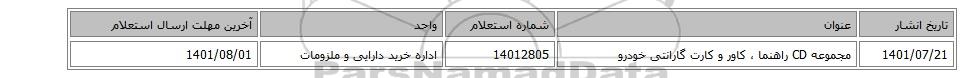 | 1401/07/21 | مجموعه CD راهنما ، کاور و کارت گارانتی خودرو | 14012805 | اداره خرید دارایی و ملزومات | 1401/08/01 |