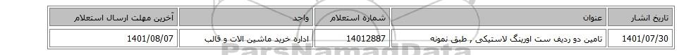 | 1401/07/30 | تامین دو ردیف ست اورینگ لاستیکی , طبق نمونه | 14012887 | اداره خرید ماشین الات و قالب | 1401/08/07 |