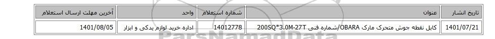 | 1401/07/21 | کابل نقطه جوش متحرک مارک OBARA/شماره فنی 200SQ*3.0M-27T | 14012778 | اداره خرید لوازم یدکی و ابزار | 1401/08/05 |