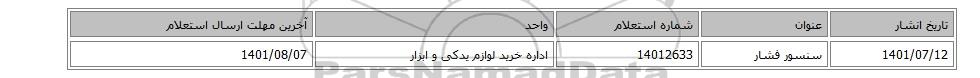 | 1401/07/12 | سنسور فشار | 14012633 | اداره خرید لوازم یدکی و ابزار | 1401/08/07 |