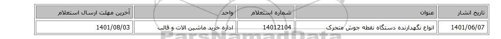 | 1401/06/07 | انواع نگهدارنده دستگاه نقطه جوش متحرک | 14012104 | اداره خرید ماشین الات و قالب | 1401/08/03 |