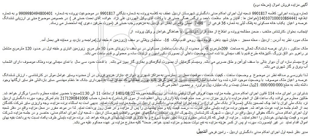 شماره پرونده اجرایی: کلاسه 9901817 شعبه اول اجرای احکام مدنی دادگستری شهرستان اردبیل عطف به کلاسه پرونده به شماره بایگانی 9901817 در موضوعیت پرونده به شماره 9909980494800401 و به شماره ابلاغیه 140107100010864441{خواهان ها : آقایان و خانم سلامت ،احمد و نرگس همگی حسنی فر با وکالت آقای وکیل الهوردی علی نژاد خوانده :آقای نعمت حسنی فر } در خصوص موضوع مبنی بر ارزیابی ششدانگ عرصه و اعیان یکباب خانه مسکونی به پلاک ثبتی به شماره 36 فرعی از 7498 اصلی واقع در بخش دو اردبیل به مرحوم رجب حسنی فر (مورث طرفین دعوی )به استحضار می رساند.