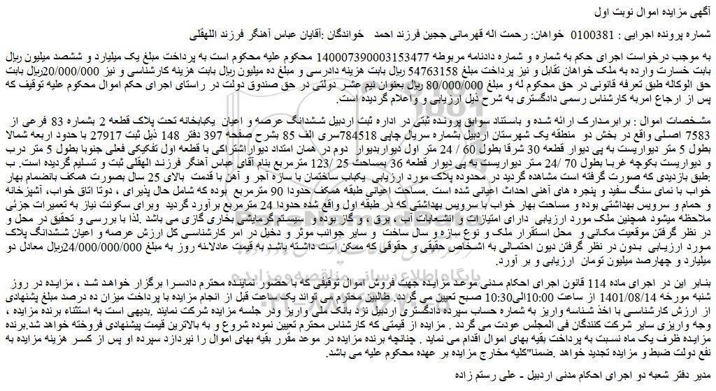 شماره پرونده اجرایی : 0100381  خواهان: رحمت اله قهرمانی ججین فرزند احمد   خواندگان :آقایان عباس آهنگر فرزند اللهقلی