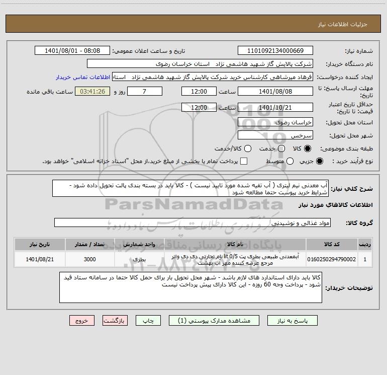 نام دستگاه خریدار:شرکت پالایش گاز شهید هاشمی نژاد استان خراسان رضوی