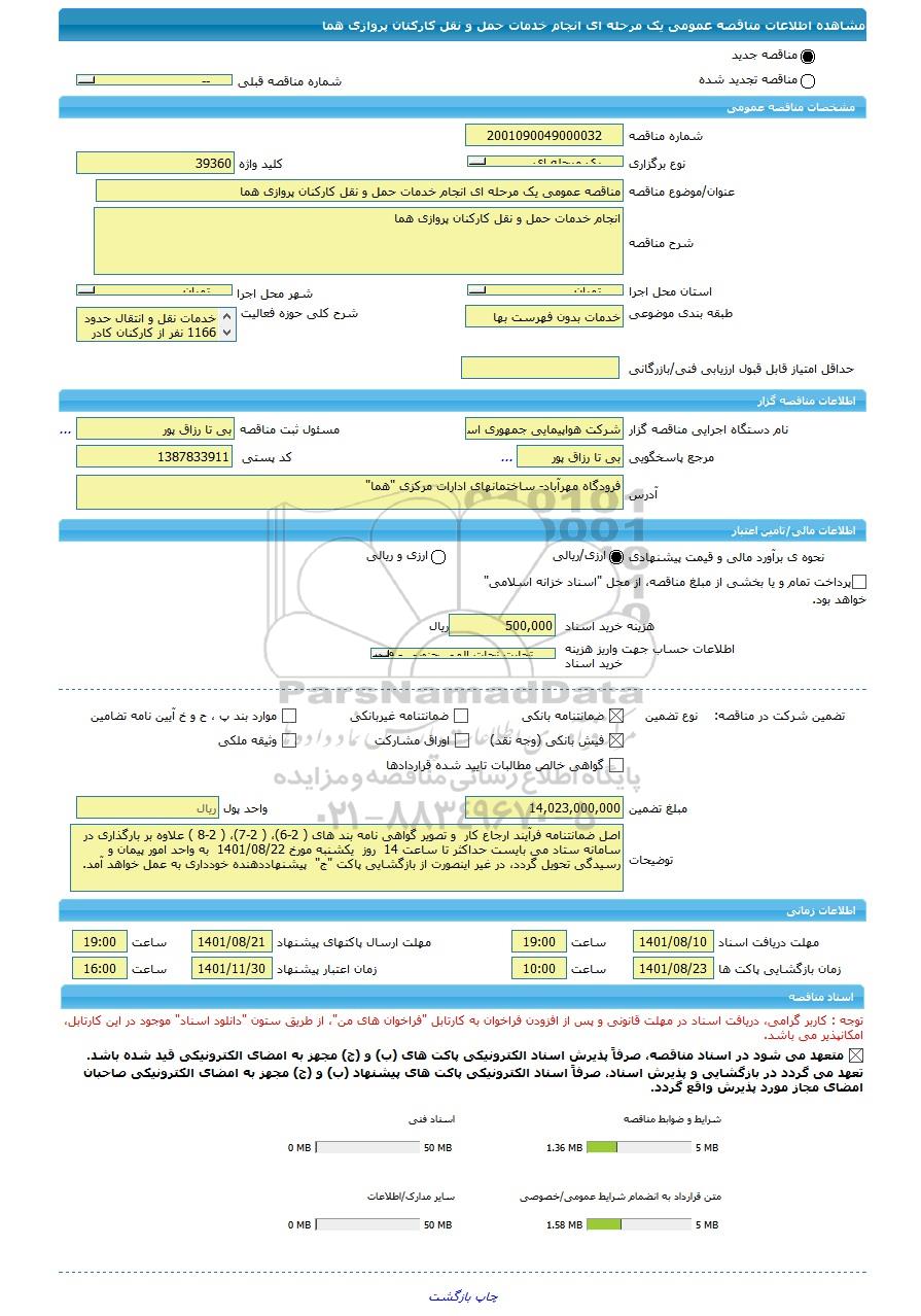 | مبلغ تضمین | 14,023,000,000 | واحد پول | ریال |