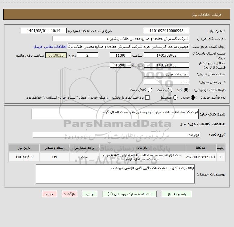 نام دستگاه خریدار:شرکت گسترش معادن و صنایع معدنی طلای زرشوران
