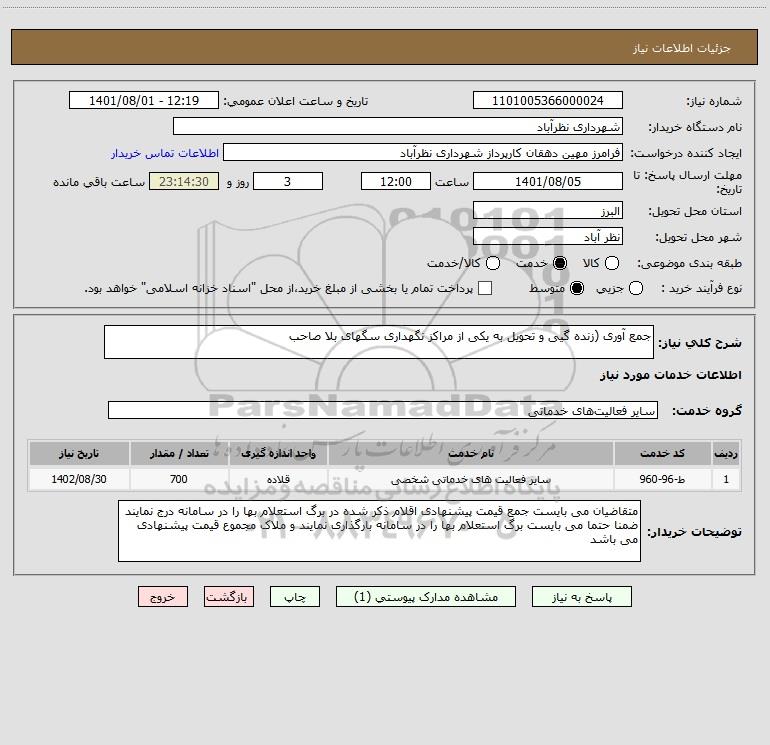 شرح کلی نیاز: جمع آوری (زنده گیی و تحویل به یکی از مراکز نگهداری سگهای بلا صاحب