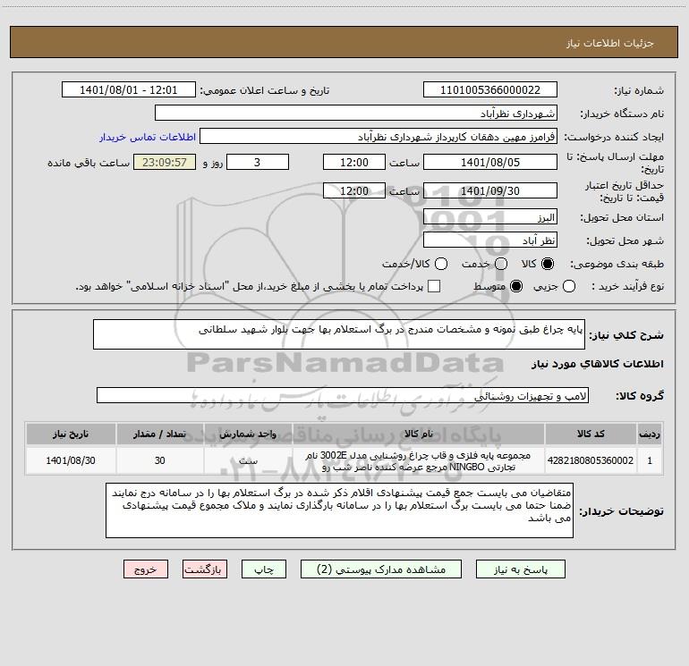 شرح کلی نیاز: پایه چراغ طبق نمونه و مشخصات مندرج در برگ استعلام بها جهت بلوار شهید سلطانی