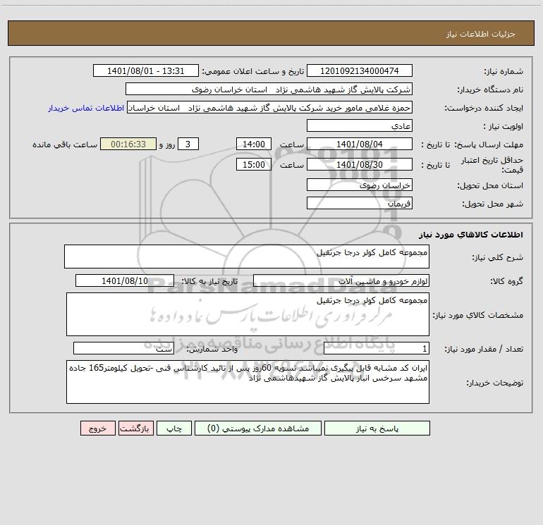 نام دستگاه خریدار:شرکت پالایش گاز شهید هاشمی نژاد استان خراسان رضوی