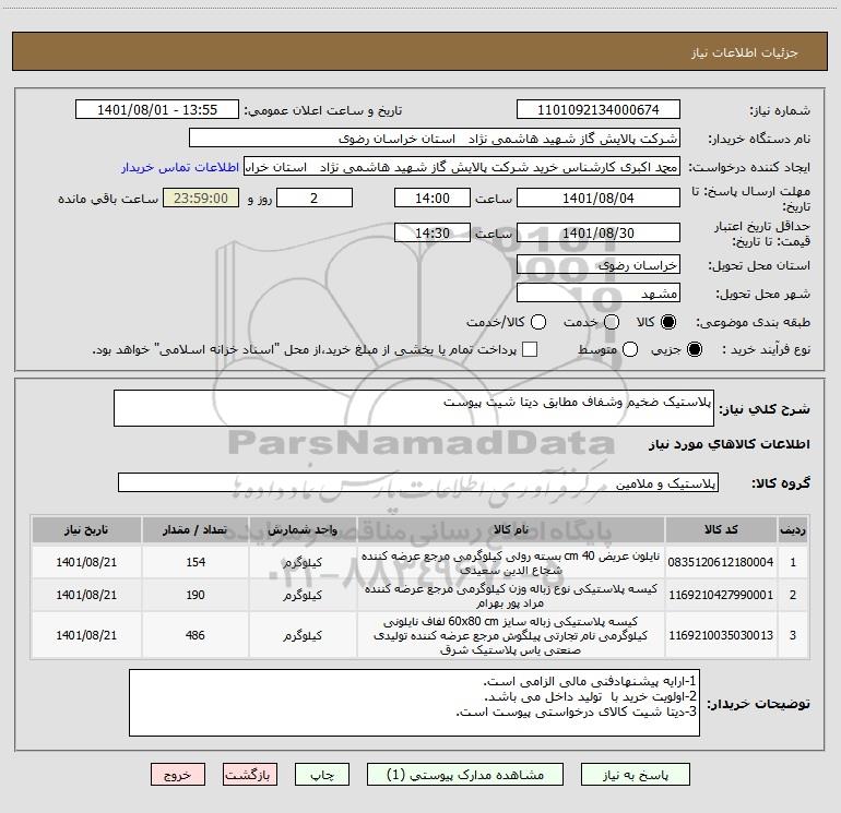 نام دستگاه خریدار:شرکت پالایش گاز شهید هاشمی نژاد استان خراسان رضوی
