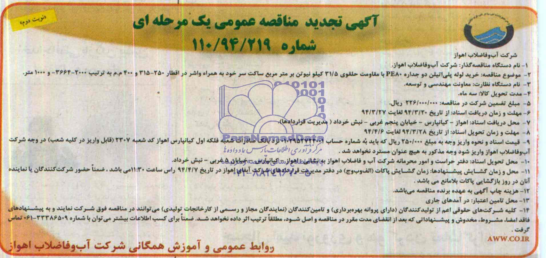 نام دستگاه مناقصه گزار: شرکت آب و فاضلاب اهواز