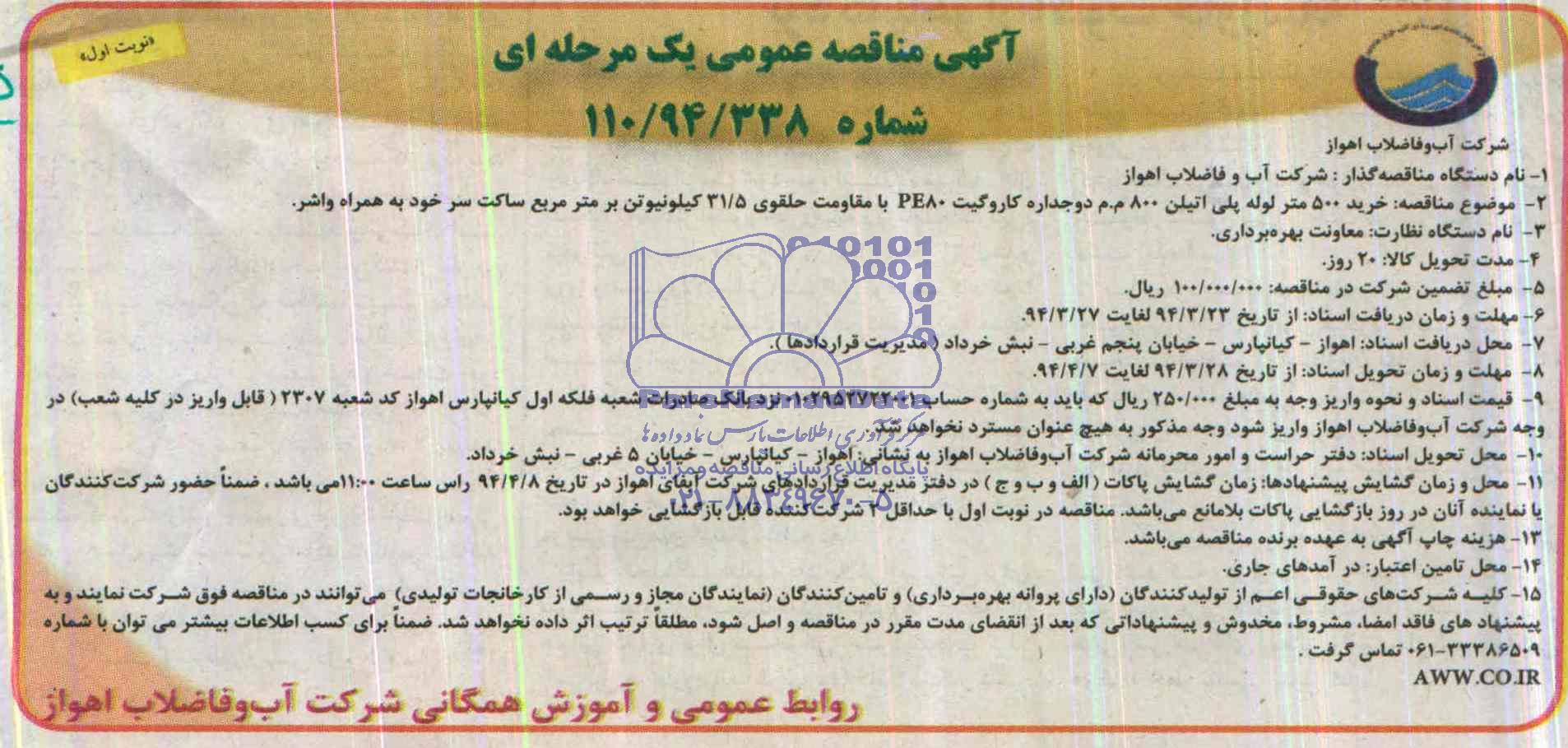 نام دستگاه مناقصه گزار: شرکت آب و فاضلاب اهواز