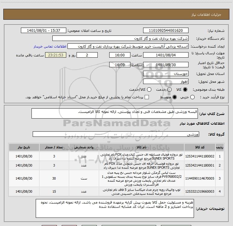 شرح کلی نیاز: البسه ورزشی طبق مشخصات فنی و تعداد پیوستی. ارائه نمونه کالا الزامیست.