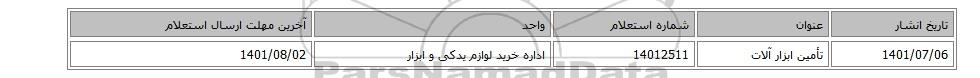 | 1401/07/06 | تأمین ابزار آلات | 14012511 | اداره خرید لوازم یدکی و ابزار | 1401/08/02 |