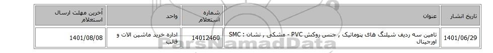 1401/06/29تامین سه ردیف شیلنگ های پنوماتیک , جنس روکش ‎PVC - مشکی , نشان : SMC اورجینال14012460اداره خرید ماشین الات و قالب1401/08/08