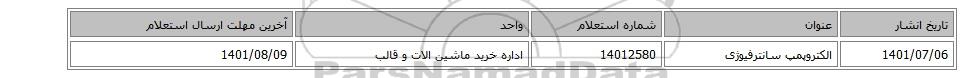 | 1401/07/06 | الکتروپمپ سانترفیوژی | 14012580 | اداره خرید ماشین الات و قالب | 1401/08/09 |