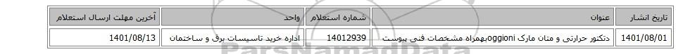 1401/08/01دتکتور حرارتی و متان مارک oggioniبهمراه مشخصات فنی پیوست14012939اداره خرید تاسیسات برق و ساختمان1401/08/13
