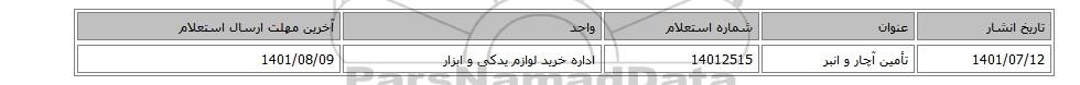 | 1401/07/12 | تأمین آچار و انبر | 14012515 | اداره خرید لوازم یدکی و ابزار | 1401/08/09 |