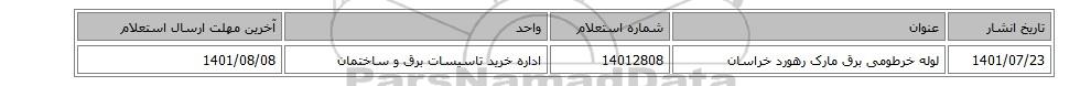| 1401/07/23 | لوله خرطومی برق مارک رهورد خراسان | 14012808 | اداره خرید تاسیسات برق و ساختمان | 1401/08/08 |