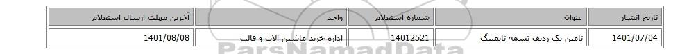 | 1401/07/04 | تامین یک ردیف تسمه تایمینگ | 14012521 | اداره خرید ماشین الات و قالب | 1401/08/08 |