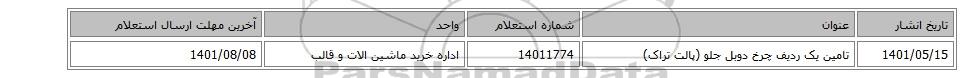 | 1401/05/15 | تامین یک ردیف چرخ دوبل جلو (پالت تراک) | 14011774 | اداره خرید ماشین الات و قالب | 1401/08/08 |