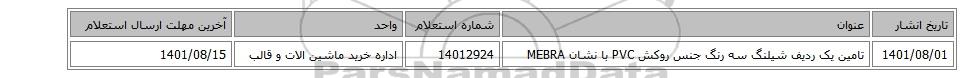| 1401/08/01 | تامین یک ردیف شیلنگ سه رنگ جنس روکش PVC با نشان MEBRA | 14012924 | اداره خرید ماشین الات و قالب | 1401/08/15 |