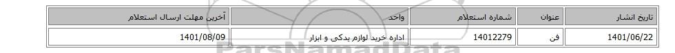 | 1401/06/22 | فن | 14012279 | اداره خرید لوازم یدکی و ابزار | 1401/08/09 |